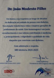 O segundo secretário e ex-presidente do CRM-PB, João Modesto Filho, foi homenageado no XXV Congresso da Sociedade Brasileira de Diabetes, realizado entre os dias 29 e 31 de outubro, no Rio de Janeiro (RJ).